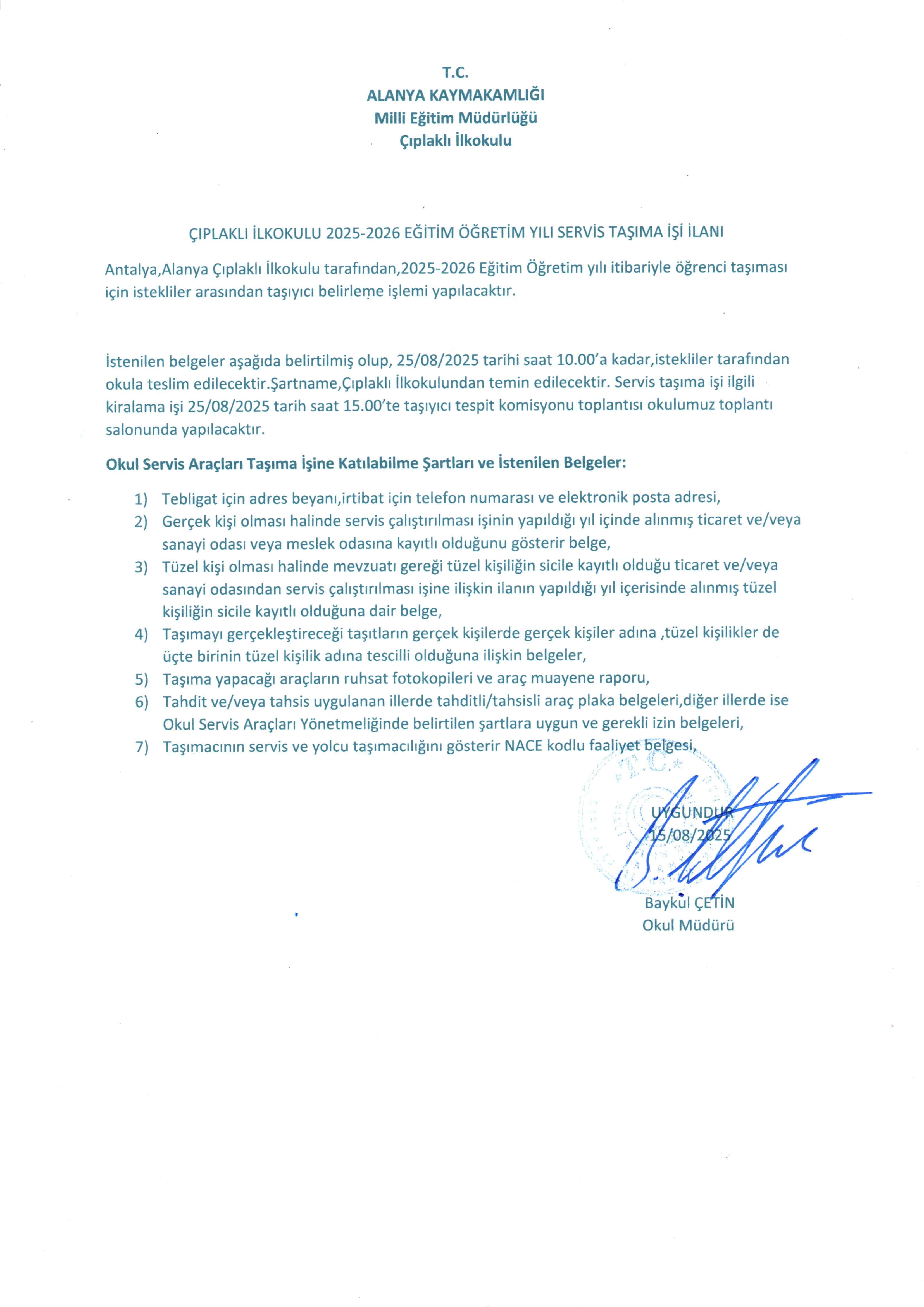 Okulumuz Çıplaklı İlkokulu öğrencilerinin 2025-2026 Eğitim-Öğretim yılı ulaşım ihtiyacının karşılanabilmesi amacıyla servis hizmeti alımı yapılacaktır.